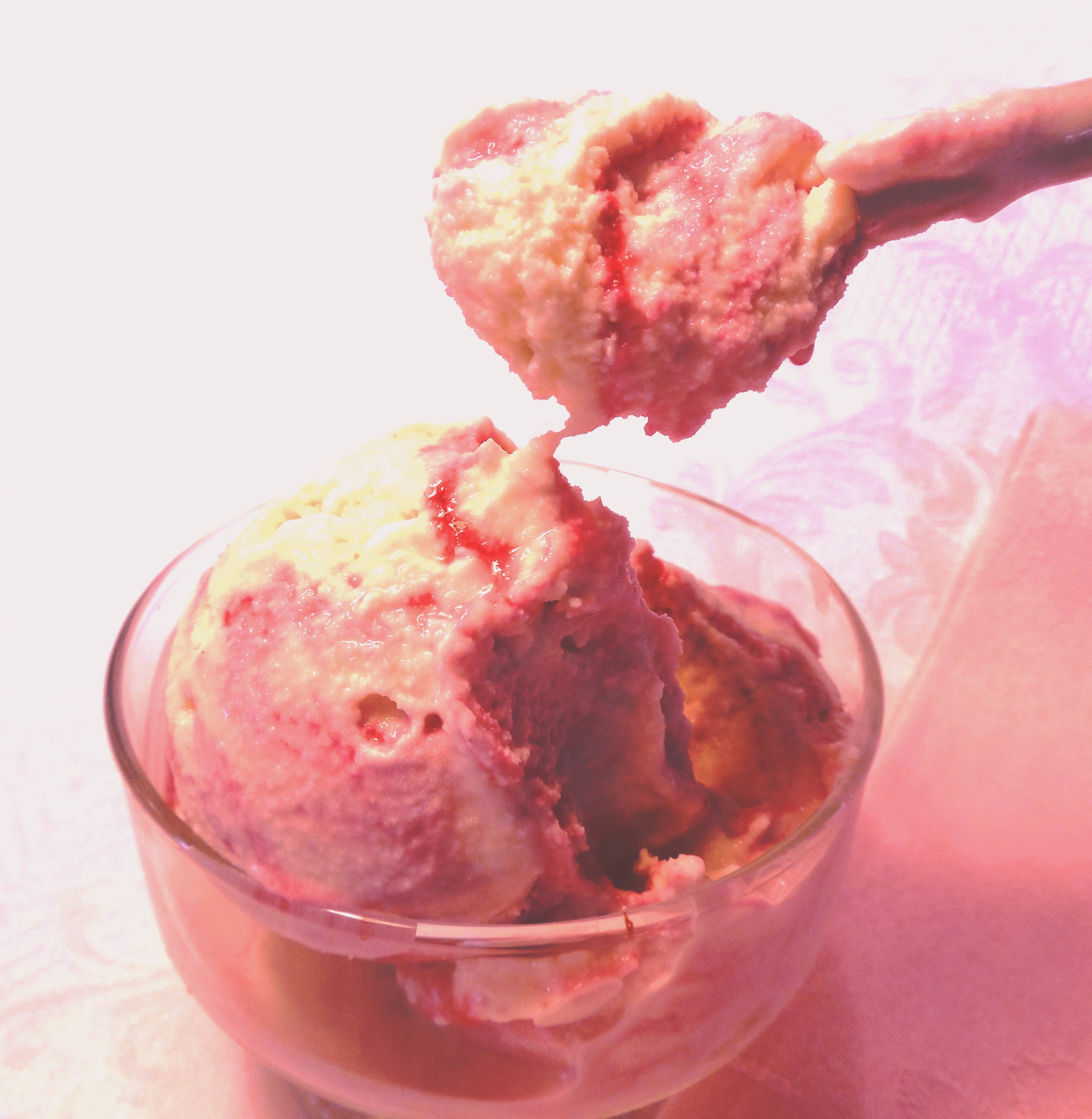 When ready to make the ice cream. Freeze the vanilla ice cream in an ice cream freezer. After the vanilla is finished, swirl in the raspberry sauce, but do not mix completely, leave it swirled.