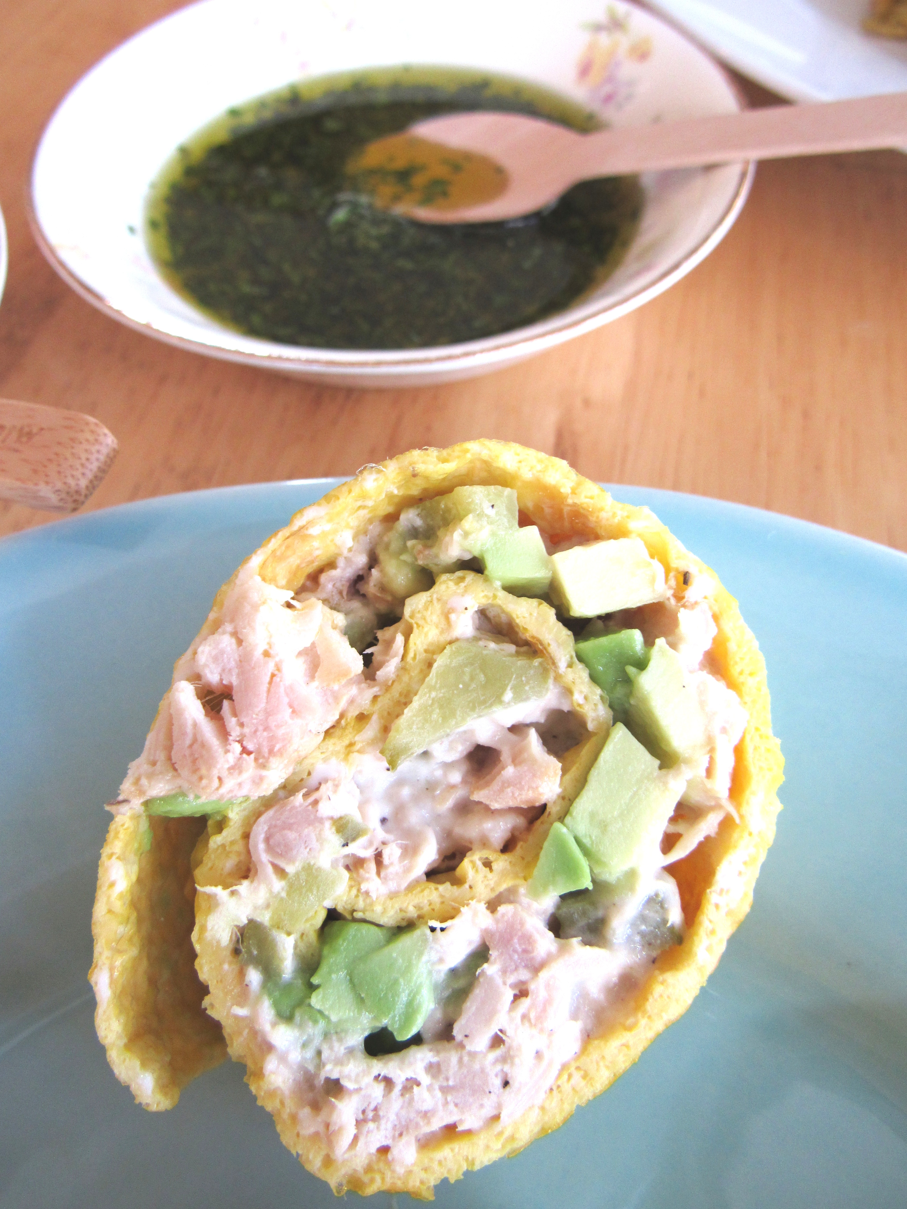Meanwhile heat your corn tortillas in the smaller pan in avocado oil one at a time, flipping them with tongs to warm both sides.