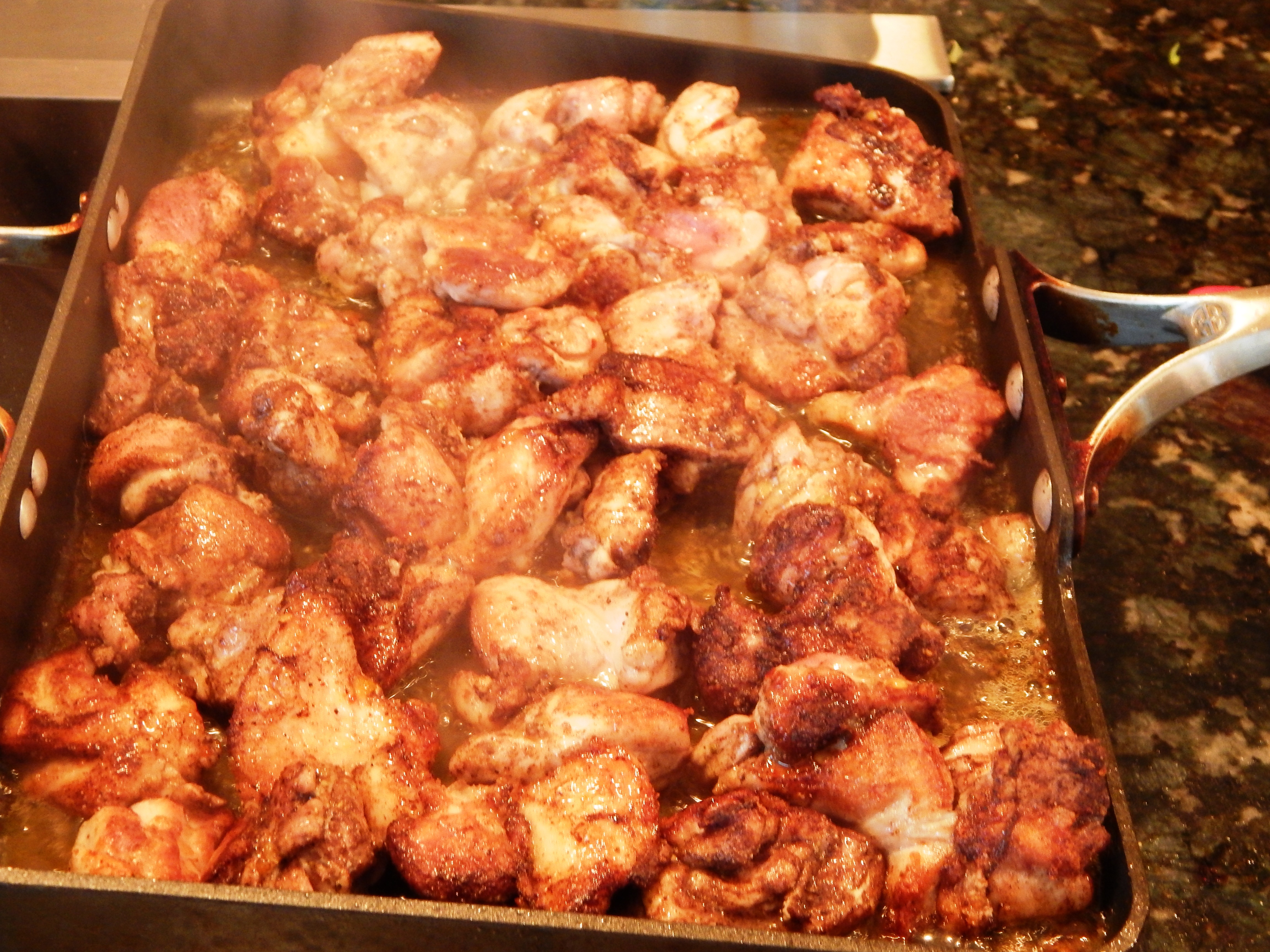 Directions for the Chicken: In a large oven safe skillet, add the olive oils over medium high heat, swirling to coat the pan. Then add the seasoned chicken when the olive oil is hot enough to sizzle. Cook the chicken four minutes on one side or until golden brown, then flip the cubes and brown the other side. When the chicken is brown but not cooked through, pour the reduced chicken sauce over the chicken in the skillet, and toss to coat evenly. Place the skillet into the oven and cook the chicken an additional five minutes, or until the chicken is done. Spoon the chicken into a bowl and pour the sauce from the pan and all the brown bits over the chicken.